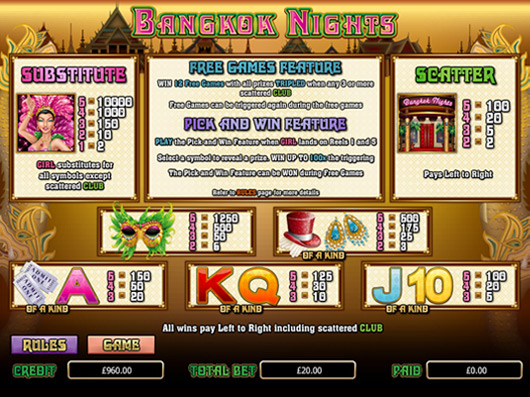 Bangkok Nights is a five-reel, twenty-pay lines